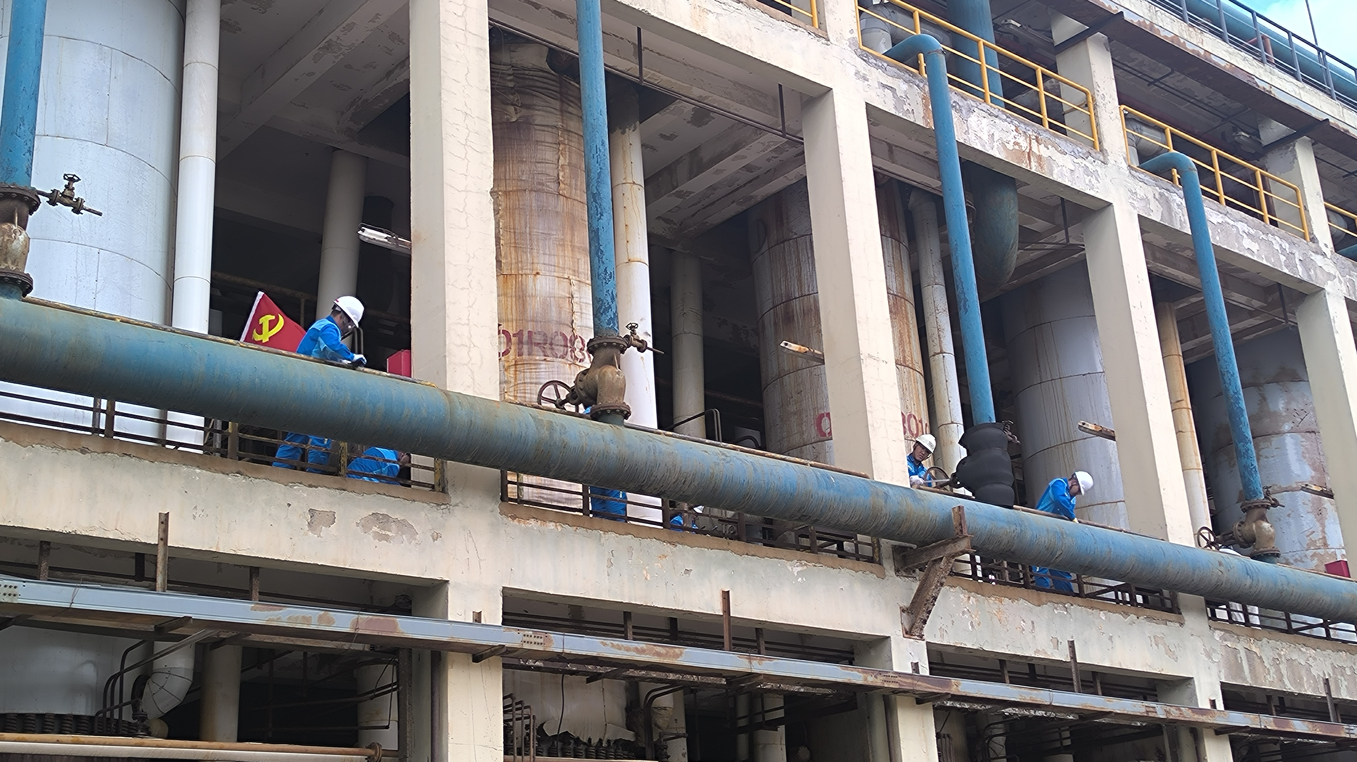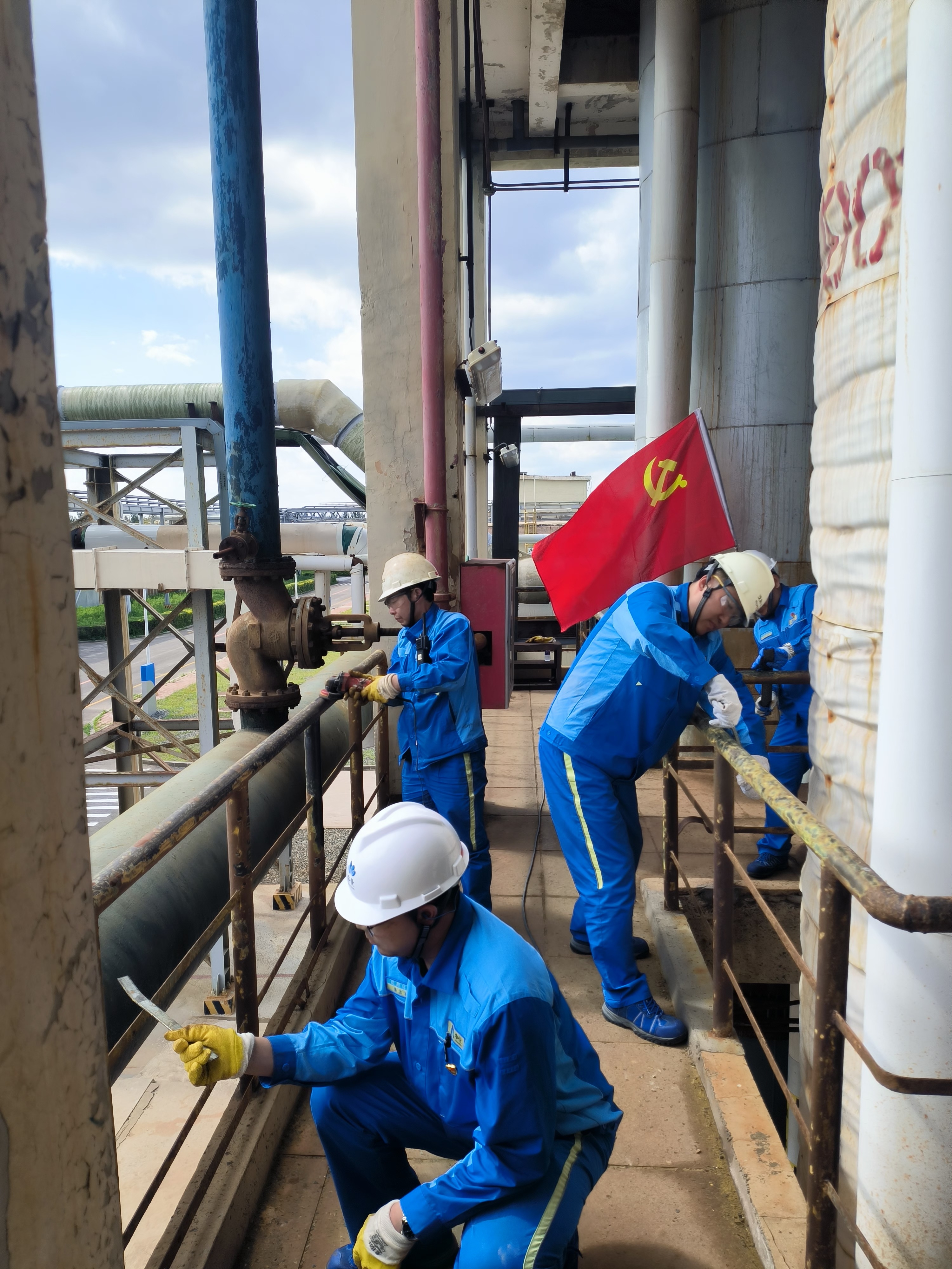 2024年5月31日,氯堿分廠黨總支組織在班黨員,在分廠鹽酸架臺(tái)開展了“除銹刷漆提升現(xiàn)場(chǎng)環(huán)境”黨員活動(dòng)。